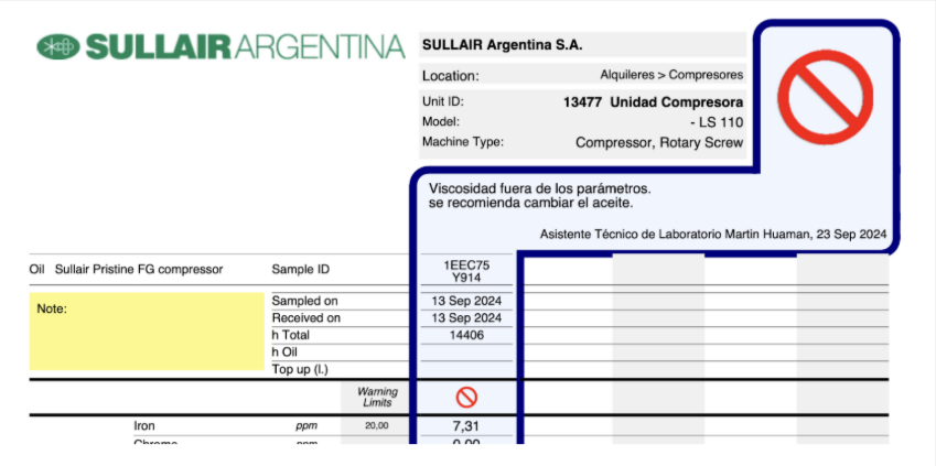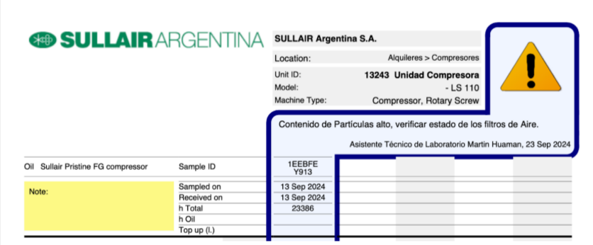 El Laboratorio de Tribología inhouse de Sullair Argentina realiza estudios de aceite y entrega un informe preciso sobre el estado en que se encuentra, detallando también las acciones recomendadas que deben realizarse.