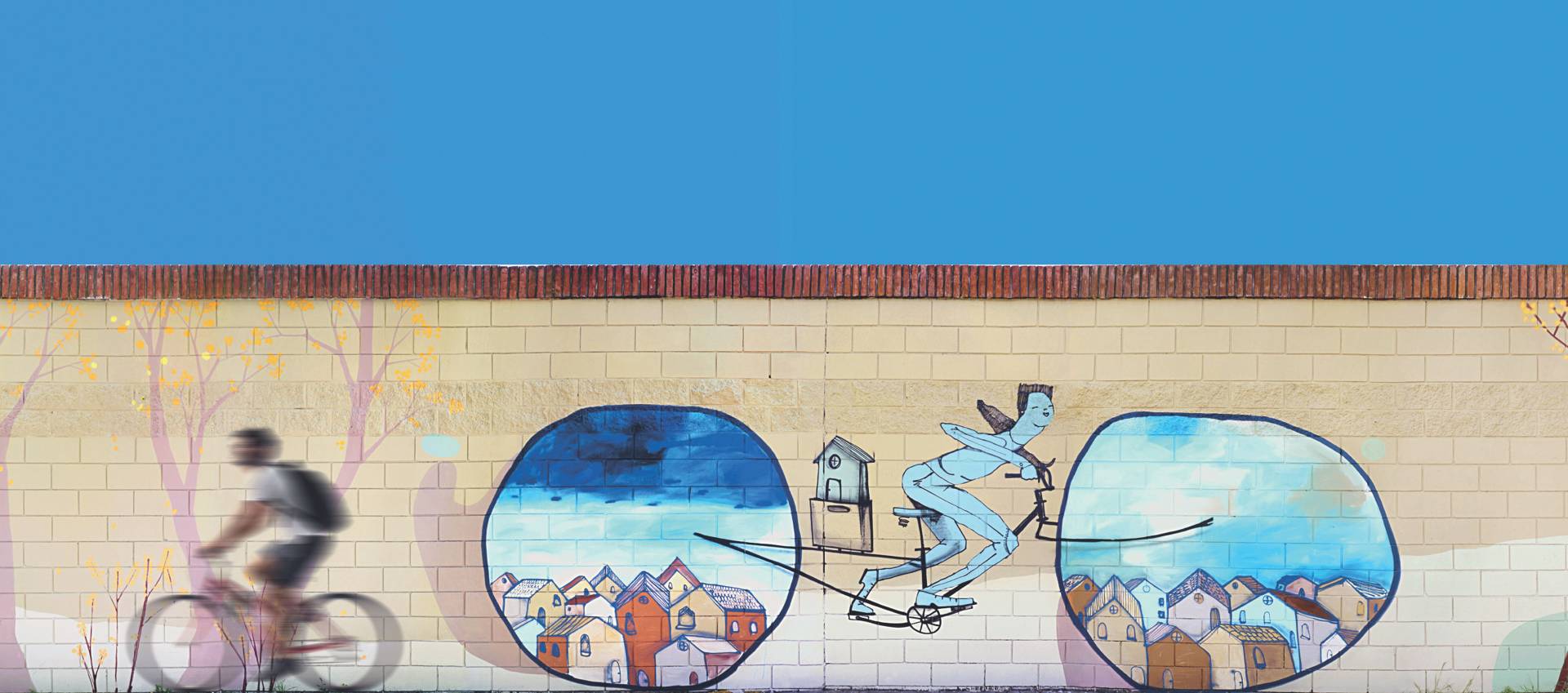 El primer gran mural fue “Bicicletas”, realizado por los artistas Mart Aire y Pol Corona. A lo largo de cientos de metros del perímetro de nuestra empresa, las bicicletas de Mart comenzaron a rodar por los muros acompañadas por los pequeños mundos que Pol imaginó dentro de sus ruedas.