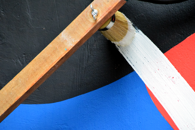 Con respecto a la pared que elegimos para la obra, finalmente quedó muy bien. Allí usé un estilo nuevo. Por muchos años trabajé sobre círculos. Pero en esta obra, pinté porciones de círculos y sus intersecciones.